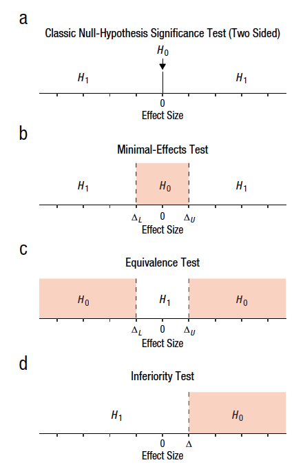Figure 1. Different forms of Null-Hypothesis Significance testing (from Lakens, 2018). The more specific you are in your prediction, the more surprising it is if the null-hypothesis is being rejected. That allows for stronger inference than unspecific testing, like in panel (a), in which the prediction merely is that the effect is ≠ 0. Alternatives are to test in different ways whether the observed effect is large enough to be deemed interesting or even different from 0.