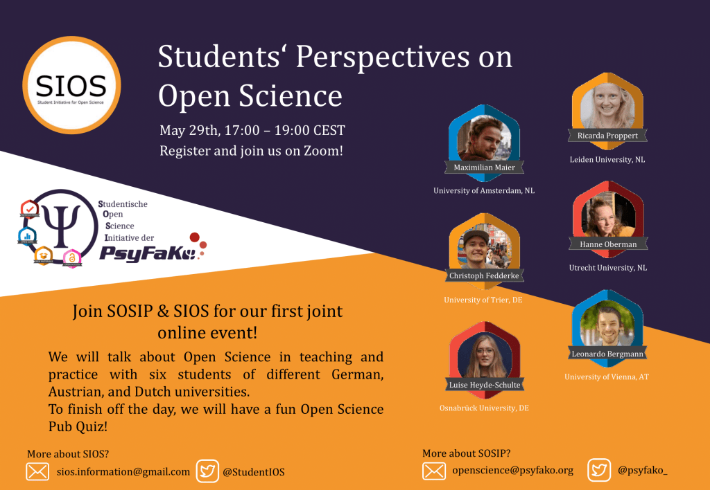 On May 29, 2020, we collaborated with PsyFako and invited six students from different Dutch, German, and Austrian universities. They shared with us their experiences with open science as students at their respective universities. After hearing about their persepctives, we were given the oppotunity to ask some questions and finished up with a pub quiz. It was really interesting to hear about the different experiences everyone had, especially across different universities and countries. We hope you guys found it interesting!